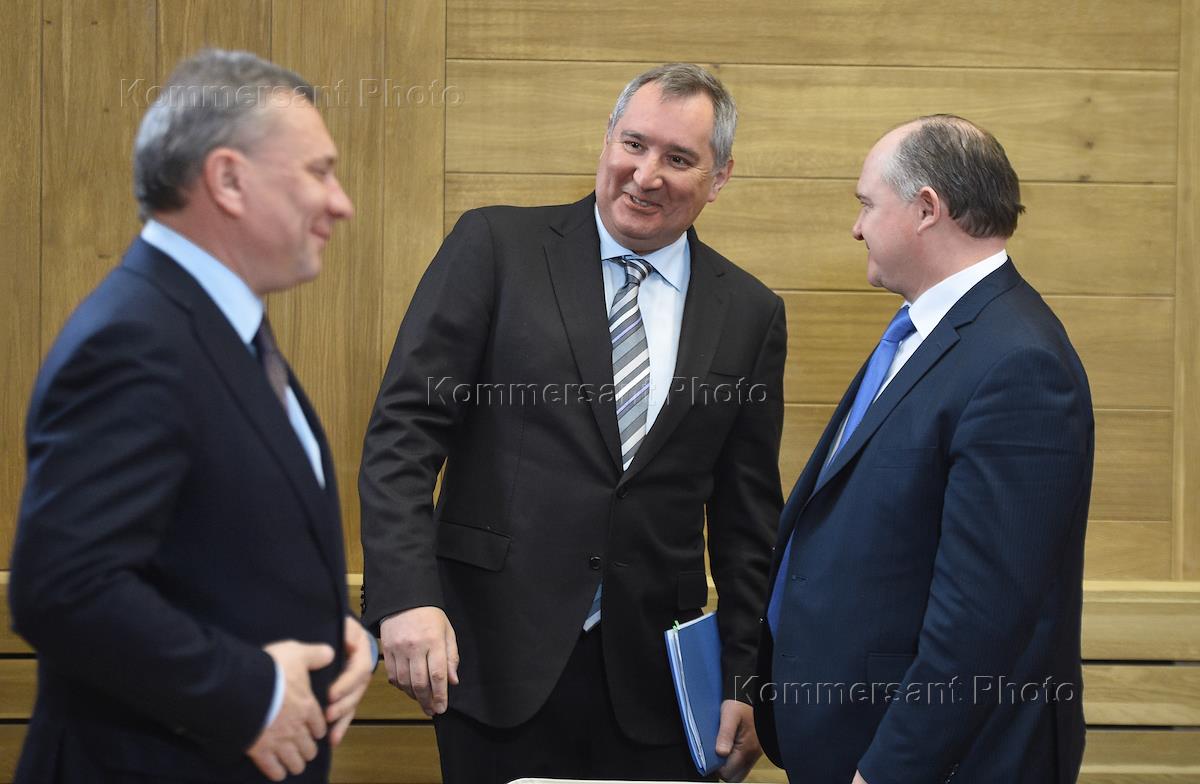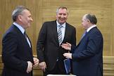 Рабочая поездка председателя правительства России Дмитрия Медведева в Киров. Слева направо: заместитель министра обороны России Юрий Борисов, заместитель председателя правительства России Дмитрий Рогозин и заместитель председателя Военно-промышленной комиссии (ВПК) при правительстве России Иван Харченко перед началом совещания о развитии производственных мощностей организаций оборонно-промышленного комплекса (ОПК). Совещание прошло на площадке АО "Кировское машиностроительное предприятие" (концерн "Алмаз - Антей").