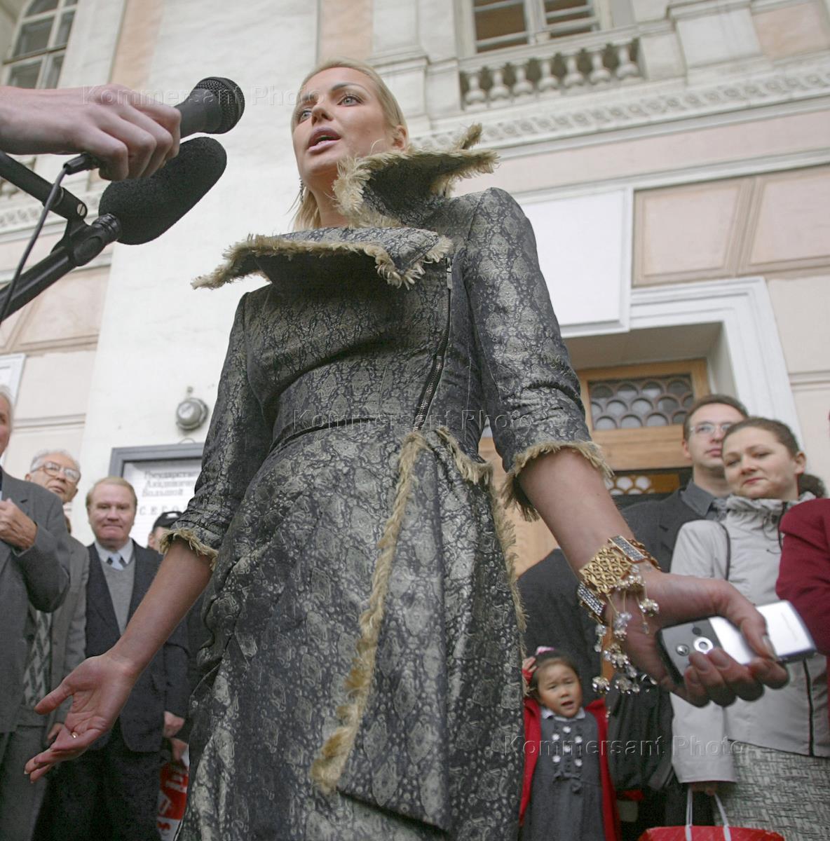 Ballet dancer Anastasia Volochkova is interviewed at the front doors of the Bolshoi Theatre surrounded by her fans who have gathered to denounce the theatre management decision to shorten the term of Ms Volochkova's contract.