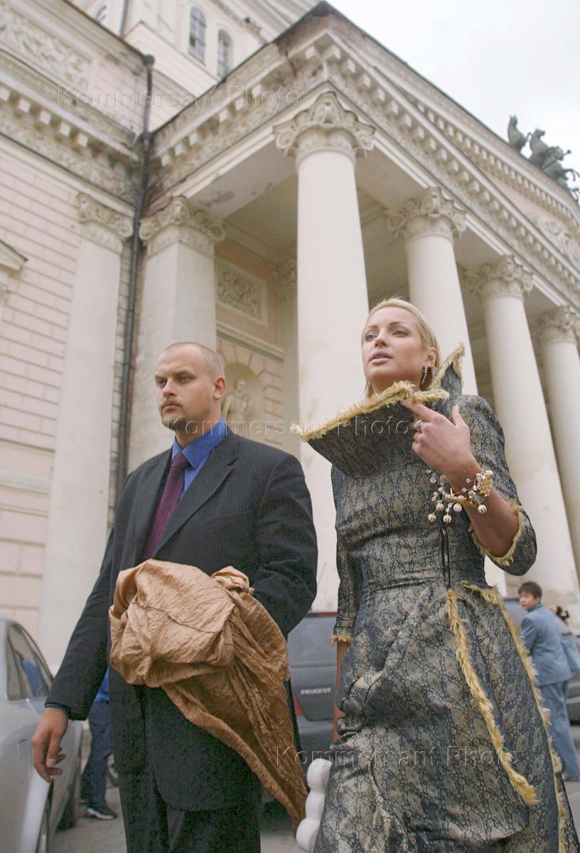 Ballet dancer Anastasia Volochkova is interviewed at the front doors of the Bolshoi Theatre surrounded by her fans who have gathered to denounce the theatre management decision to shorten the term of Ms Volochkova's contract.
