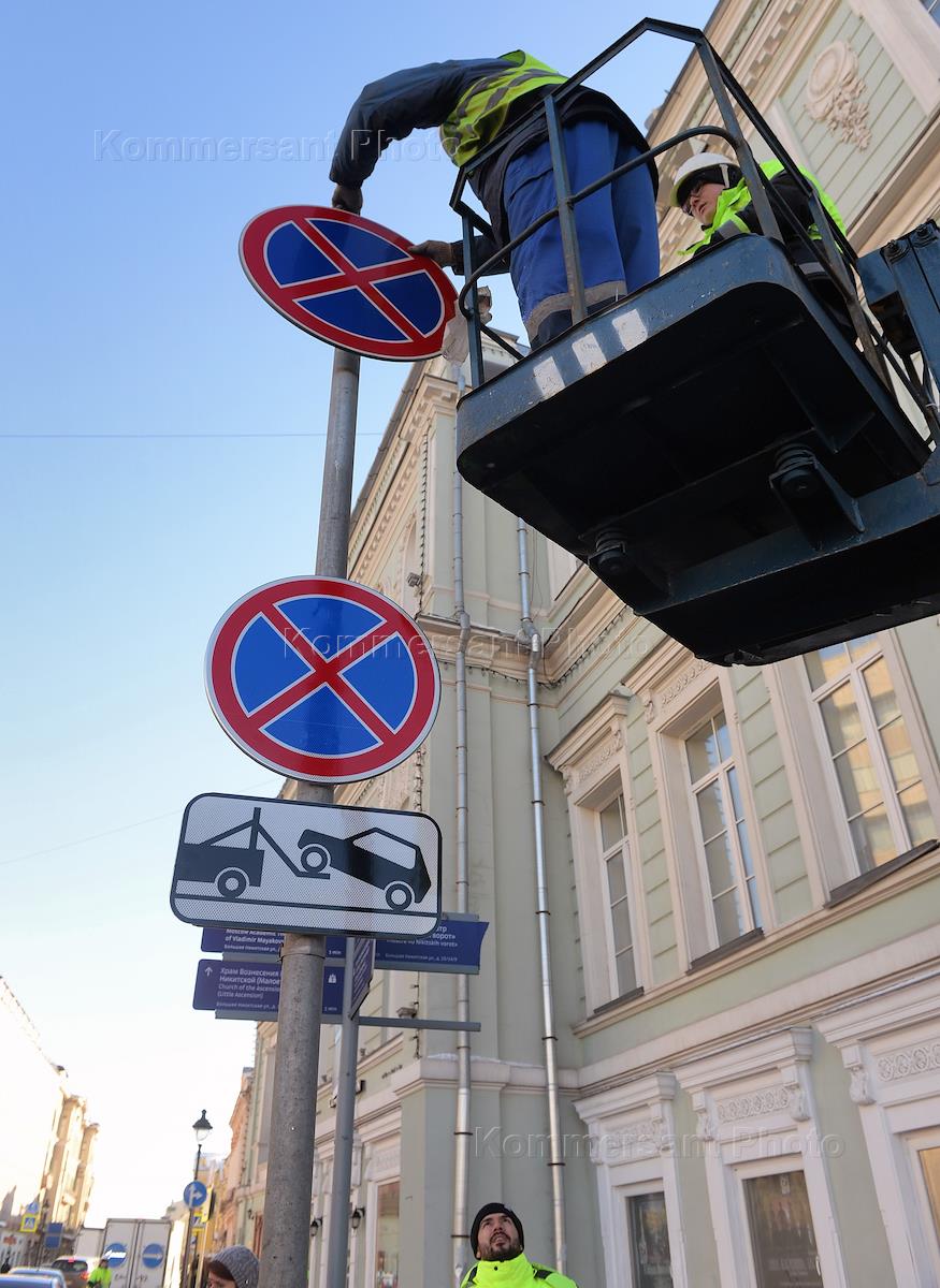 Установка дорожных знаков в рамках эксперимента по уменьшению их количества и размера на улице Большая Дмитровка.