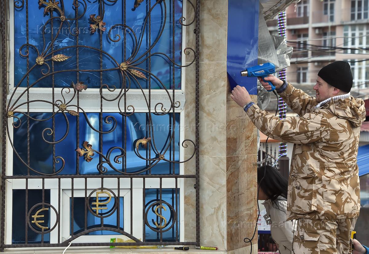 Жанровая фотография. Мужчина прикрепляет ткань к стене здания.