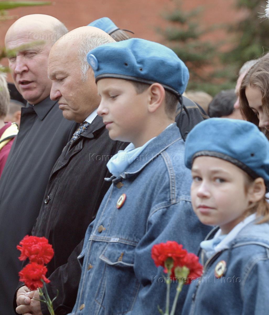 Мэр Москвы Юрий Лужков (в центре) и председатель Московской городской думы Владимир Платонов (второй справа) на торжественной церемонии возложения венков к Могиле Неизвестного солдата в Александровском саду. Возложение прошло во время празднования Дня города.