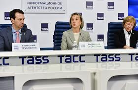 Пресс-конференция, посвященная предстоящему вручению III Всероссийской премии "За верность науке". Слева направо: заместители министра образования и науки России Григорий Трубников, Людмила Огородова и заместитель директора Института географии РАН Ольга Соломина во время пресс-конференции в пресс-центре ТАСС.