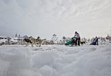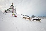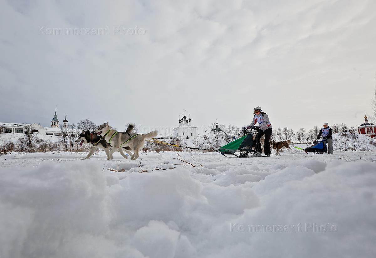 Соревнования "Суздальский луг - 2017" по гонкам на собачьих упряжках на Ильинском лугу в Суздале. Собачие упряжки с наездниками в санях во время прохождения этапа соревнований.