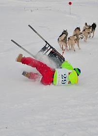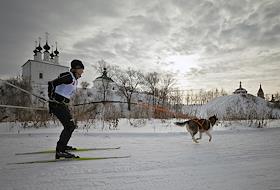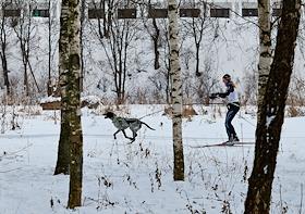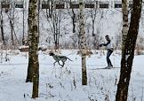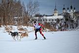 Соревнования "Суздальский луг - 2017" по гонкам на собачьих упряжках на Ильинском лугу в Суздале. Участник по скиджорингу на собаках во время прохождения этапа соревнований.