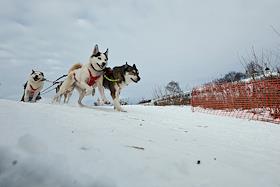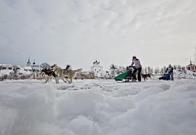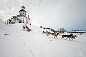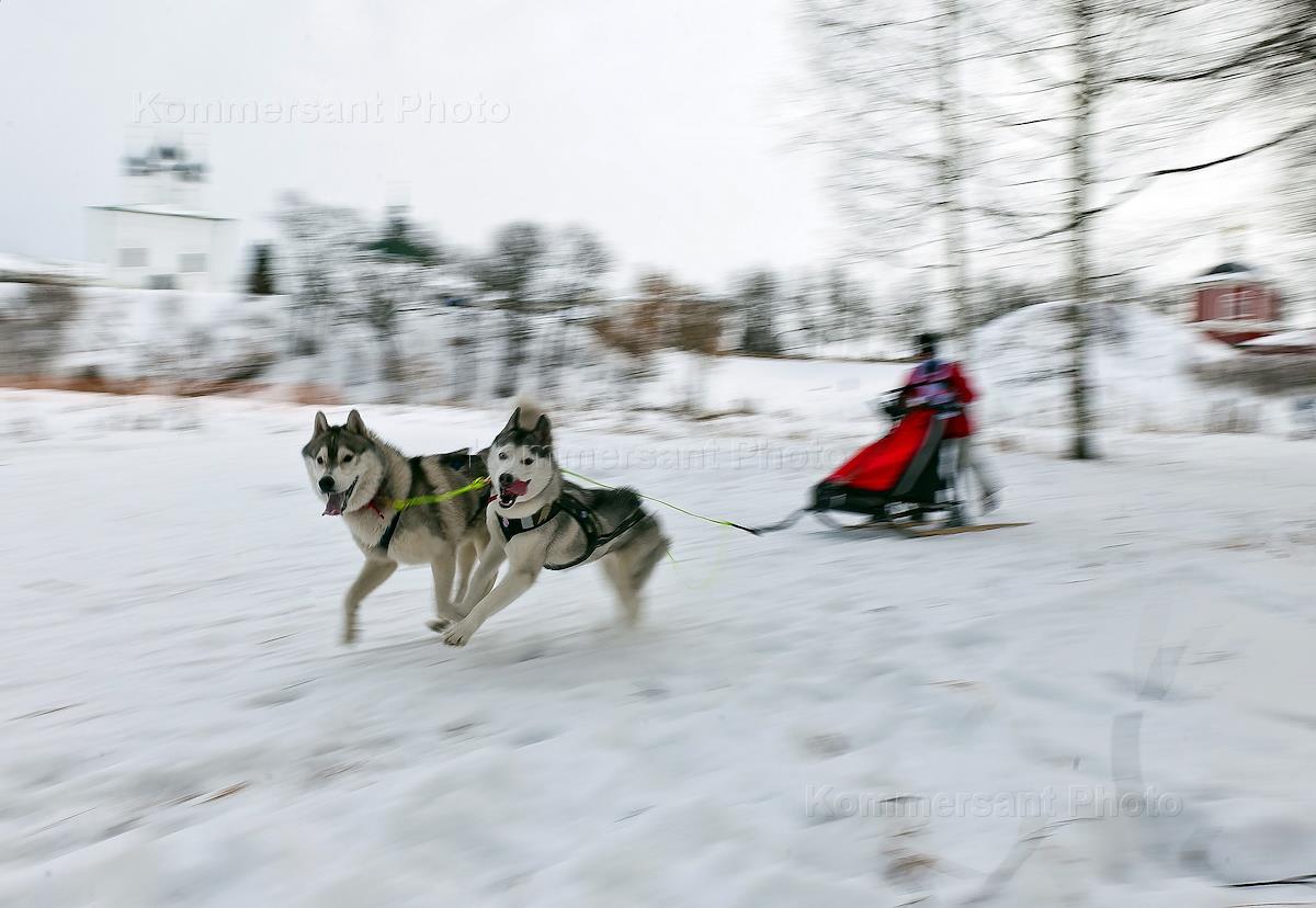 Соревнования "Суздальский луг - 2017" по гонкам на собачьих упряжках на Ильинском лугу в Суздале. Собачья упряжка во время прохождения этапа соревнований.