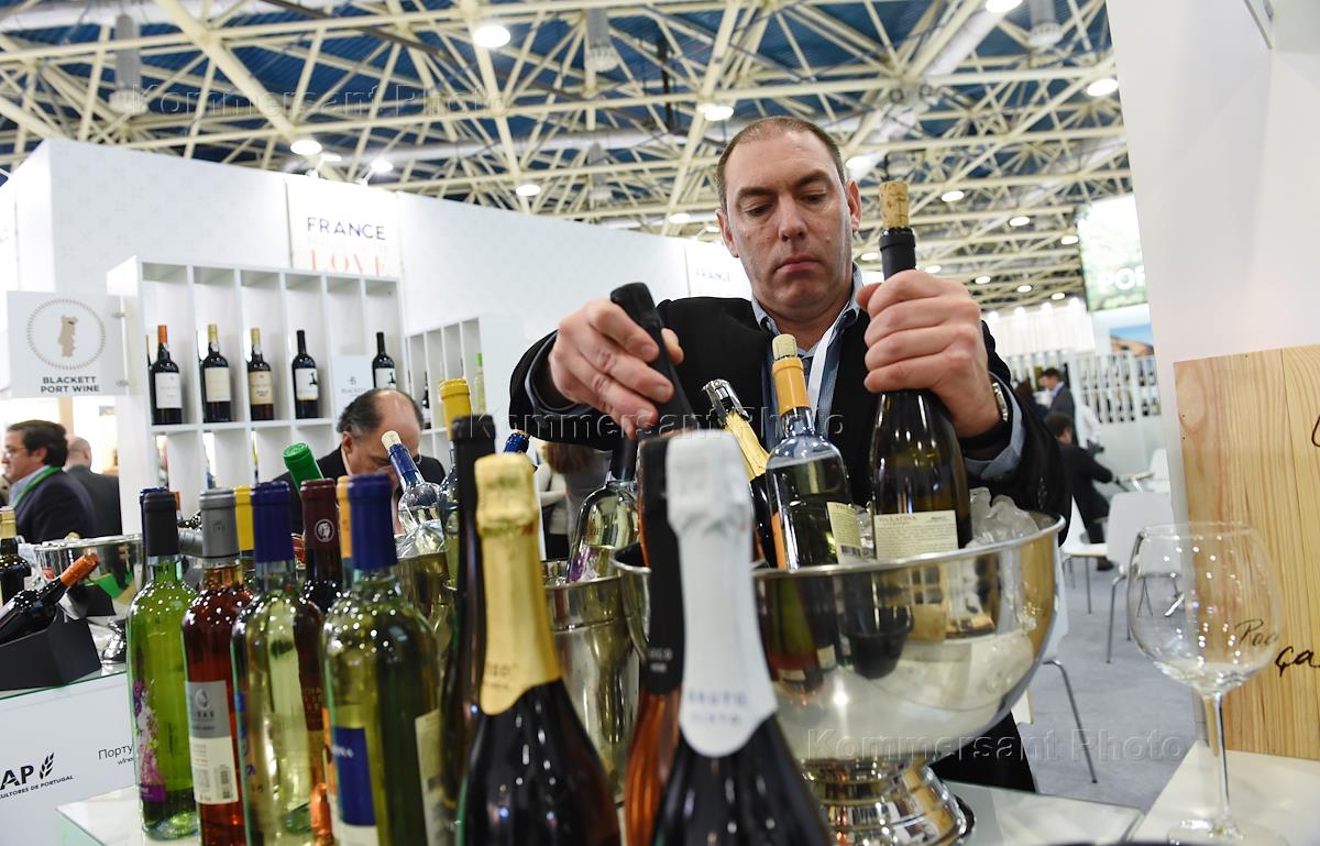 24-я Международная выставка "ПРОДЭКСПО 2017" в Центральном выставочном комплексе "Экспоцентр". Представитель компании "Усадьба Мысхако" во время демонстрации вина.