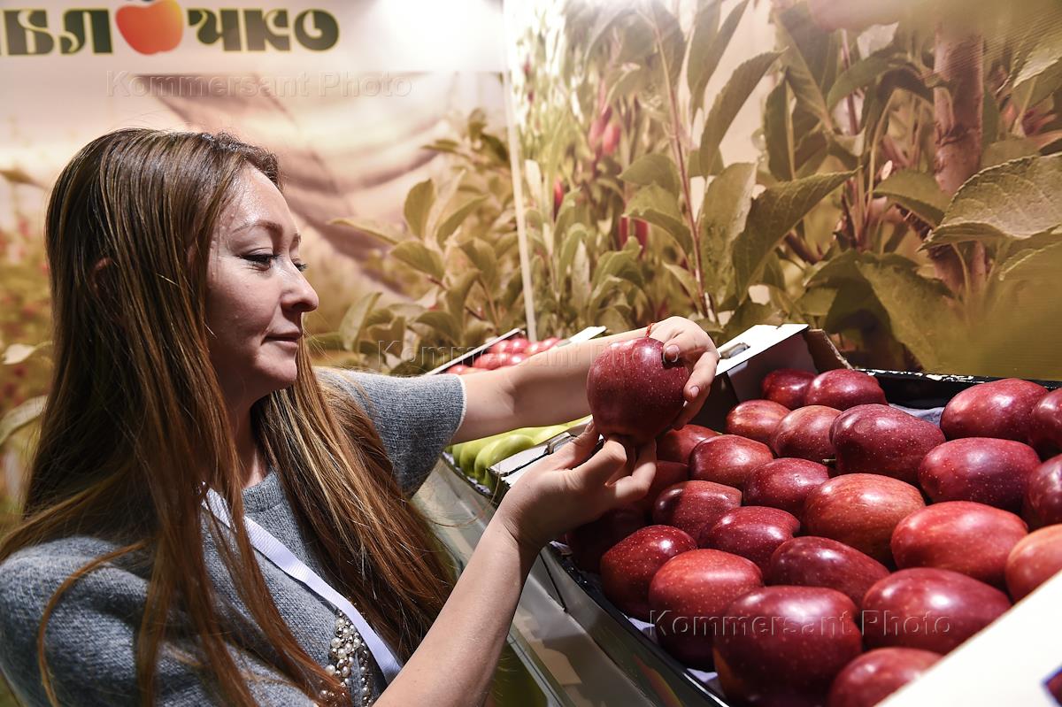 24-я Международная выставка "ПРОДЭКСПО 2017" в Центральном выставочном комплексе "Экспоцентр". Представитель предприятия "Яблочко" с яблоками у своего стенда.