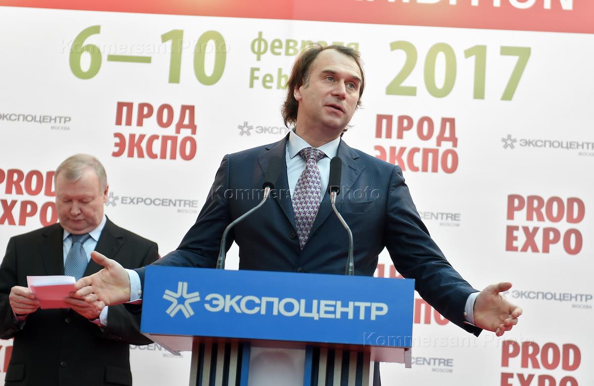 24-я Международная выставка "ПРОДЭКСПО 2017" в Центральном выставочном комплексе "Экспоцентр". Представитель в Совете Федерации от Курганской областной думы Сергей Лисовский (справа) во время церемонии открытия выставки.