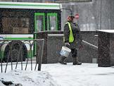 Жанровая фотография. Сотрудница коммунальных служб во время обработки реагентами лестницы подземного пешеходного перехода и тротуара.