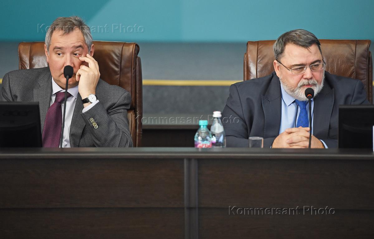 Церемония открытия специализированной электронной площадки для проведения закрытых процедур закупок в сфере государственного оборонного заказа прошла в здании Федеральной антимонопольной службы. Генеральный директор государственной корпорации "Роскосмос" Игорь Комаров (слева) и заместитель председателя Правительства России Дмитрий Рогозин (справа) во время церемонии.