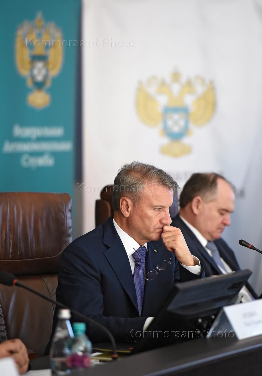 Церемония открытия специализированной электронной площадки для проведения закрытых процедур закупок в сфере государственного оборонного заказа прошла в здании Федеральной антимонопольной службы. Президент, председатель правления Сбербанка России Герман Греф (справа) во время выступления на церемонии.