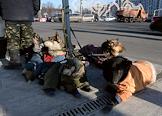 Жанровая фотография. Собаки в комбинезонах на поводках.