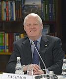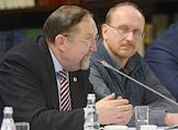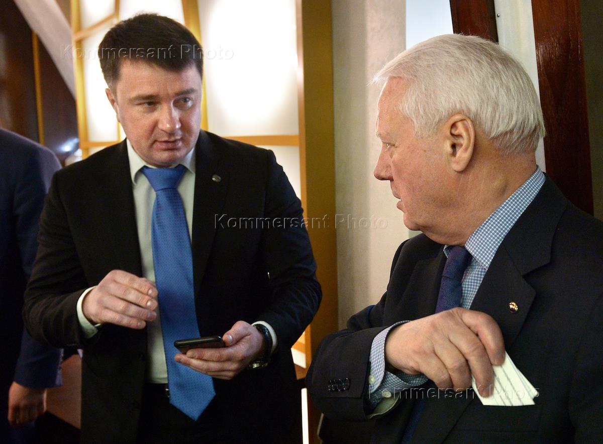 Заседание Медиаклуба Русского географического общества (РГО) в штаб-квартире РГО. Старший вице-президент Бинбанка Петр Морсин (слева) и первый вице-президент РГО Николай Касимов (справа) после окончания заседания .