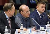 Заседание Медиаклуба Русского географического общества (РГО) в штаб-квартире РГО. Слева направо: заведующий кафедрой рекреационной географии и туризма географического факультета Московского государственного университета имени М.В.Ломоносова Виктор Кружалин, сопредседатель комиссии спелеологии и карстоведения Московского городского отделения РГО Алексей Шелепин и исполнительный директор Центра подводных исследований РГО Сергей Фокин во время заседания.