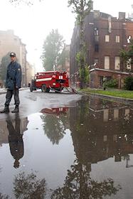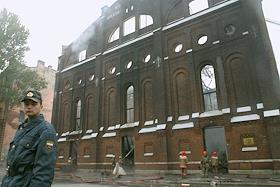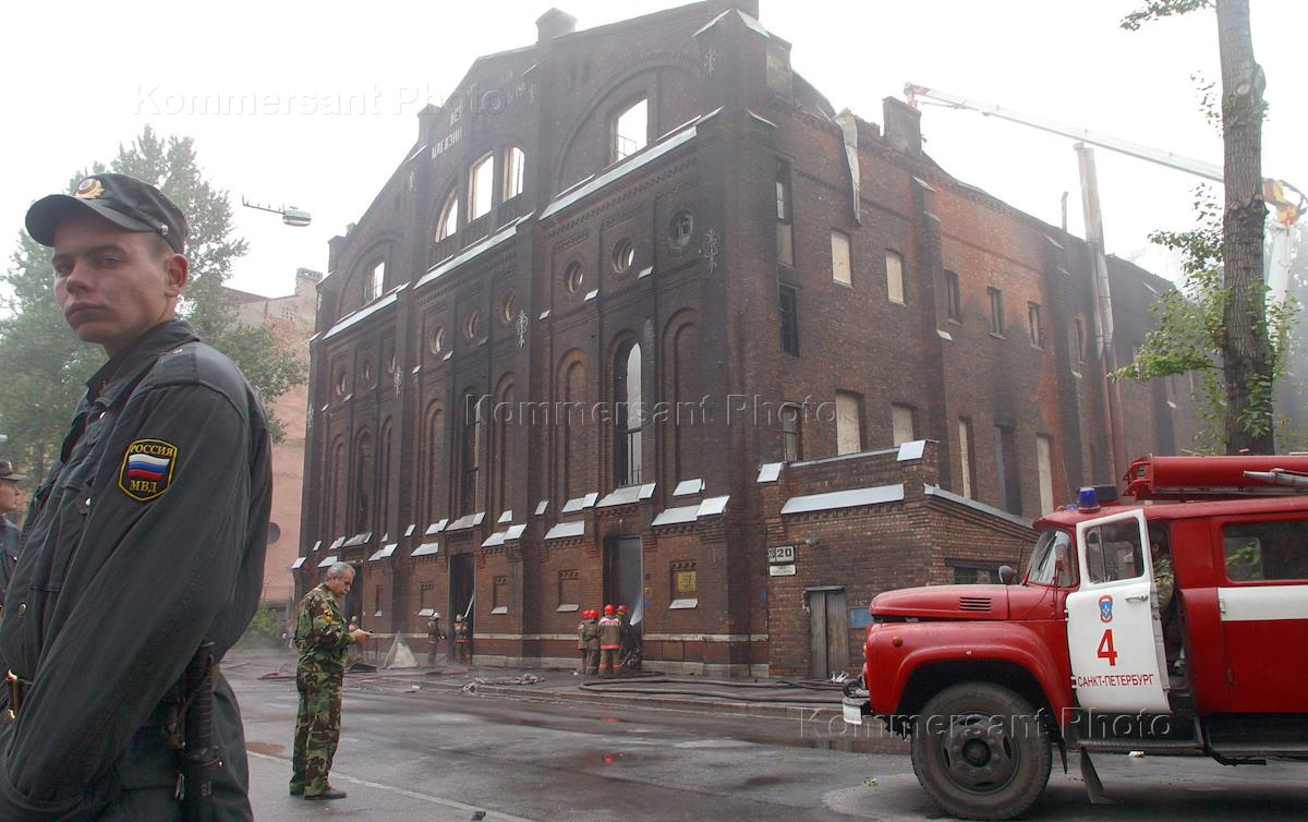 Сгоревшее здание художественно-декорационных мастерских Государственного академического Мариинского театра. Пожар вспыхнул около 2 часов утра. На тушении работало около 30 пожарных расчетов. По словам представителей администрации Мариинского театра, предварительный ущерб от пожара составил 6 млн. 965 тыс. руб.
