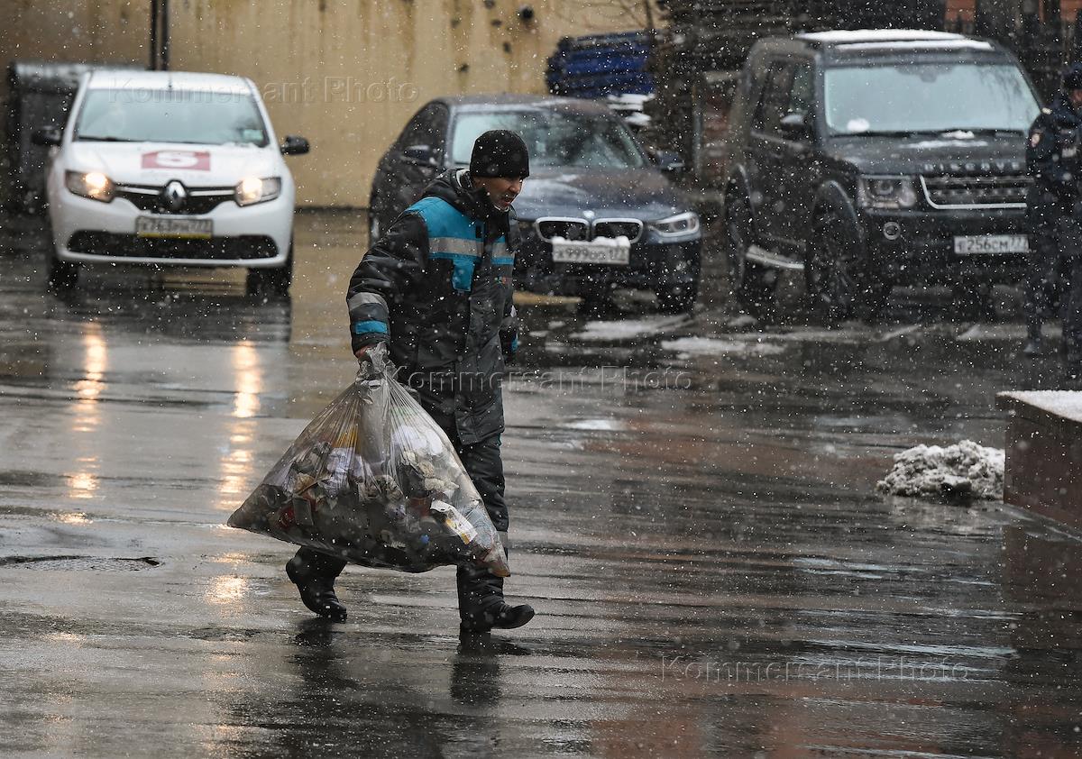 Жанровая фотография. Дворник несет мешок с мусором.