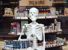 Жанровая фотография. Скелет в зале аптеки на фоне стенда с препаратами по уходу за собой.