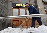 Жанровая фотография. Сотрудник коммунальных служб города убирает снег со ступеней офиса мобильной связи "Евросеть" в здании Почтамта на Тверской улице.