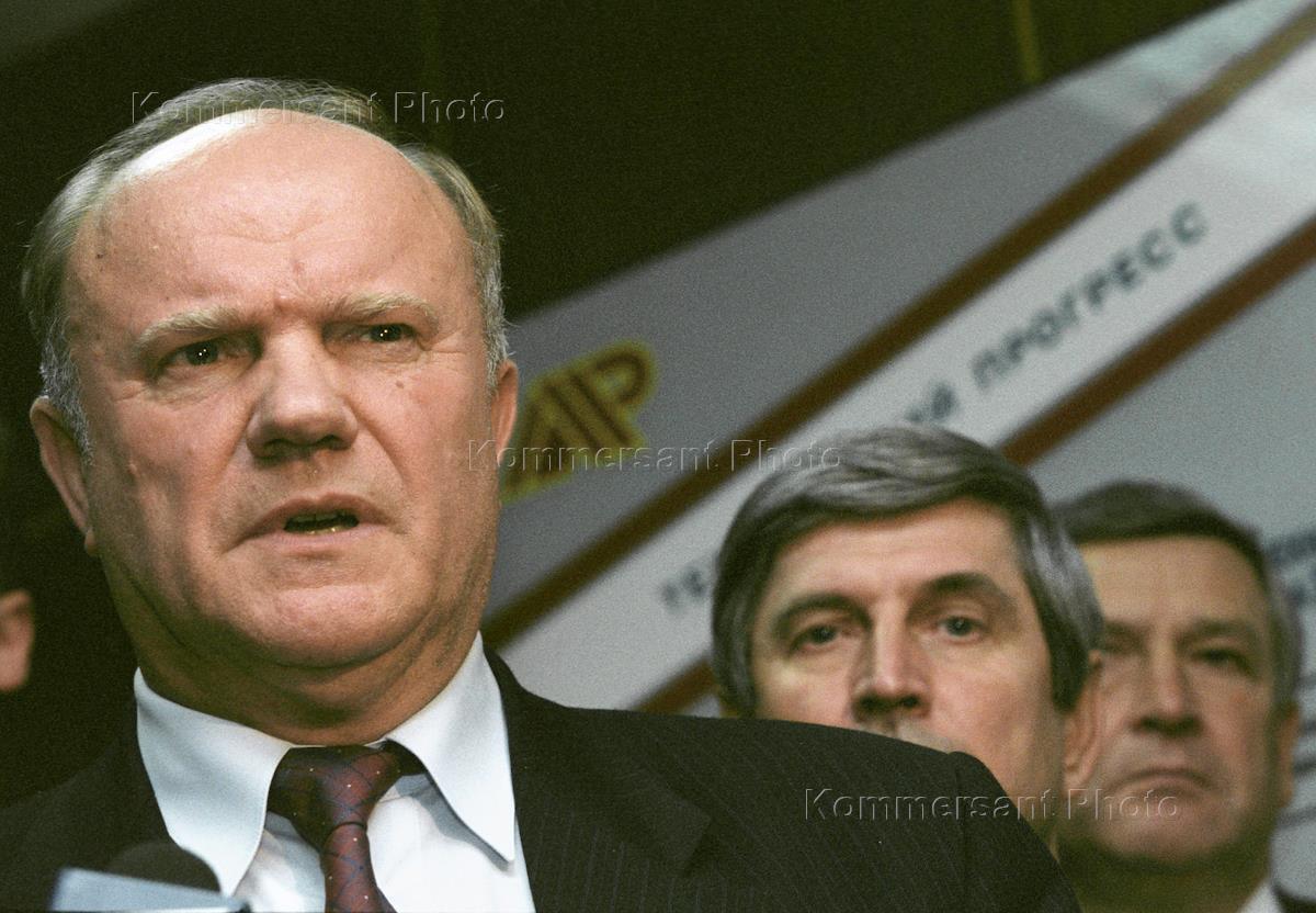 Лидер КПРФ Геннадий Зюганов (справа) на пресс-конференции после съезда Коммунистической партии России. Предвыборный съезд партии прошел в закрытом режиме в помещении Росагропромстроя.