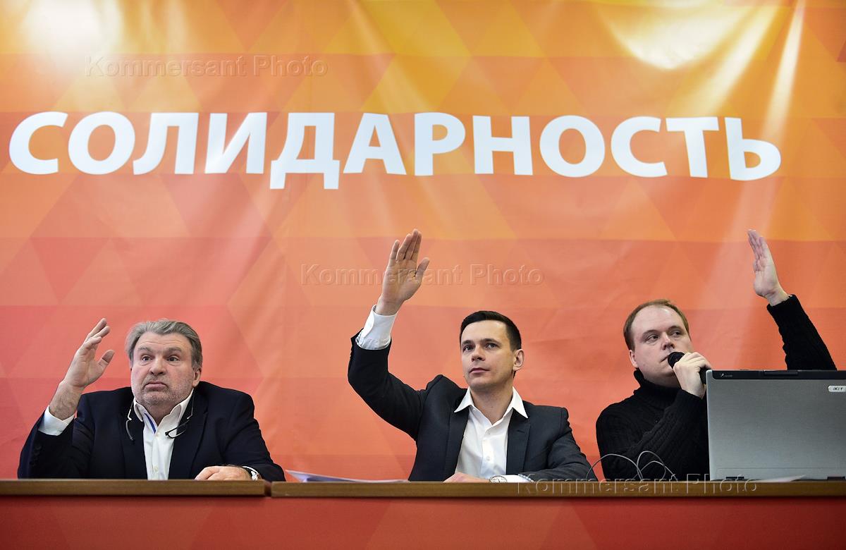 Съезд объединенного демократического движения "Солидарность". Слева направо: члены федерального политического совета движения Александр Рыклин, Илья Яшин и Илья Мищенко на заседании.
