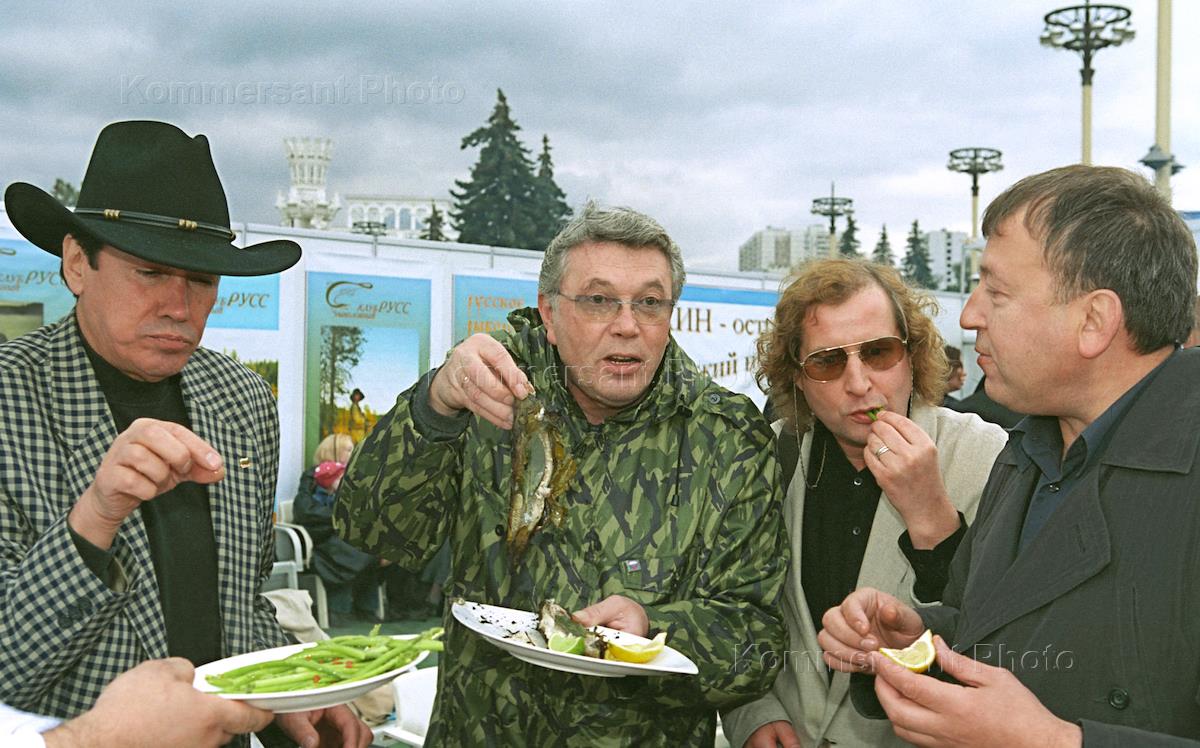 Болгарский певец Бисер Киров (слева), телеведущий Олег Марусев (второй слева), режиссер Андрей Житинкин (второй справа) и поэт Виктор Пеленягрэ (справа) на фестивале рыбацкой кухни. Фестиваль прошел на главной аллее Всероссийского выставочного центра (ВВЦ).