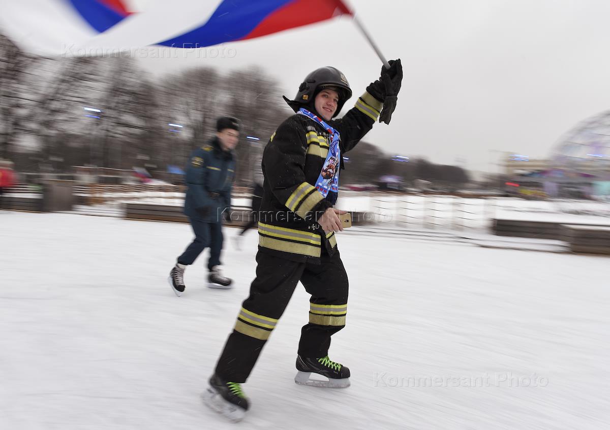 Всероссийский ежегодный пожарно-спасательный флешмоб. Участник флешмоба под девизом "МЧС России – за здоровый образ жизни!" на катке Центрального парка культуры и отдыха (ЦПКиО) имени Горького.