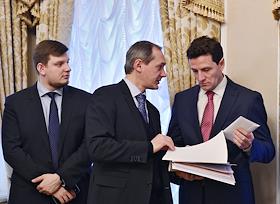 Расширенное заседание Попечительского совета киностудии "Ленфильма". Слева направо: первый заместитель президента - председателя правления банка ВТБ, президент Федерации спортивной гимнастики России Василий Титов, директор "Ленфильма" Эдуард Пичугин и заместитель министра финансов России Сергей Сторчак перед началом заседания.