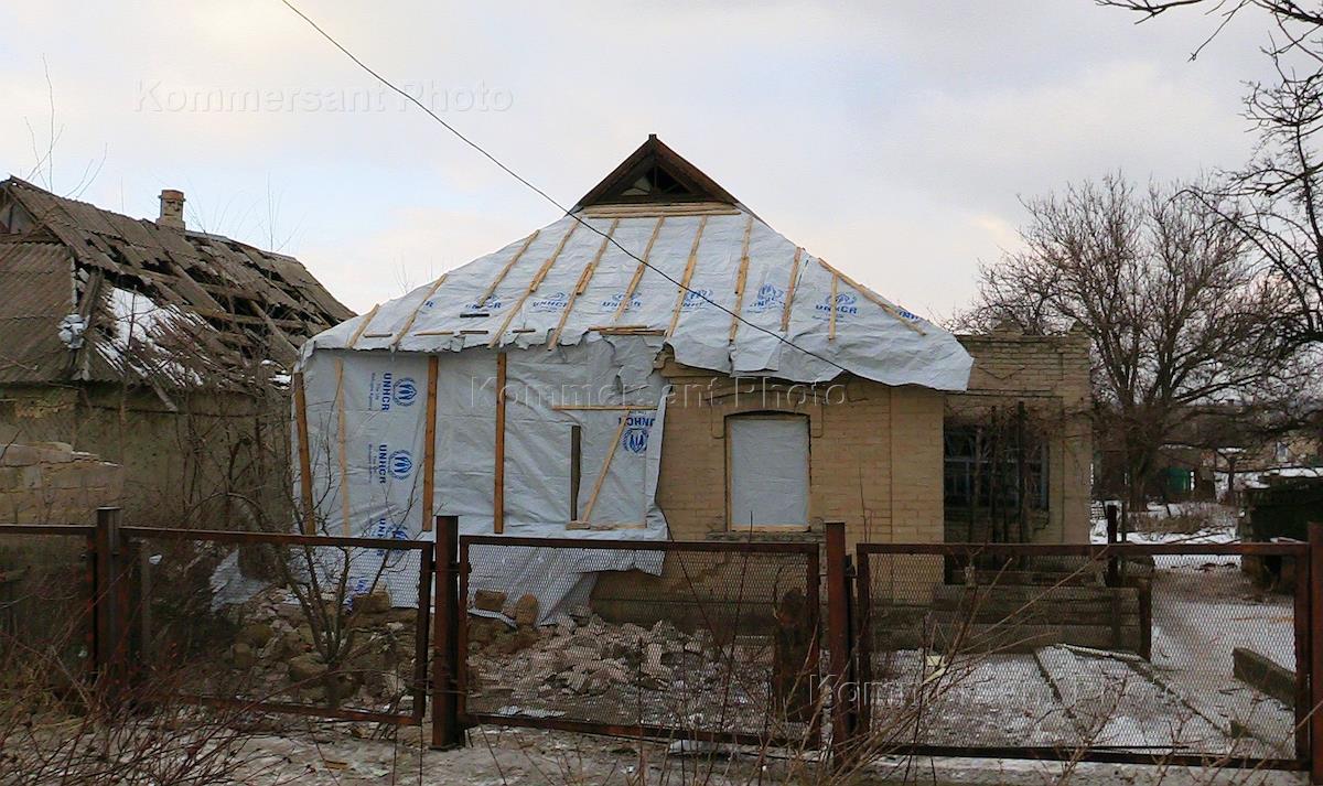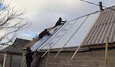 Последствия артиллерийского обстрела территории Донецкой области Вооруженными Силами (ВС) Украины. Жители поселка Старомихайловка ремонтируют крышу жилого дома пострадавшую от обстрела.