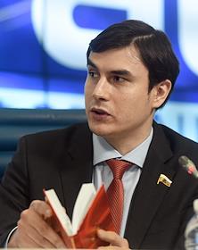 Член комитета Государственной думы (ГД) России по международным делам Сергей Шаргунов во время пресс-конференции, посвященной выходу книги лидера КПРФ Геннадия Зюганова "Время выбора, время действий!". Пресс-конференция прошла в агентстве ТАСС.