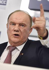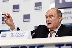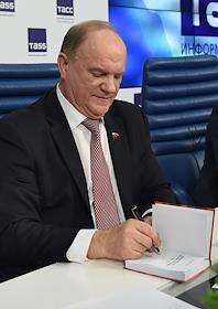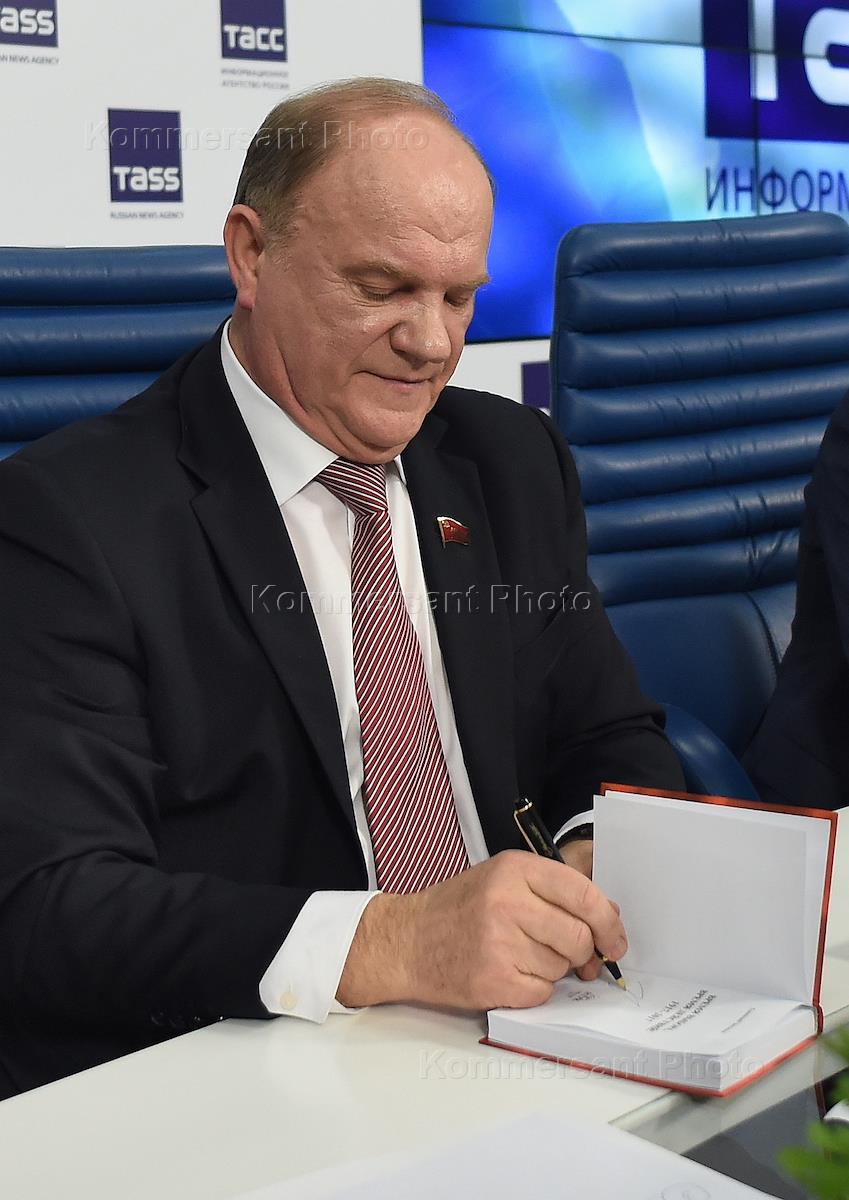 Председатель ЦК КПРФ, руководитель фракции КПРФ в Государственной думе (ГД) России Геннадий Зюганов во время пресс-конференции, посвященной выходу своей книги "Время выбора, время действий!". Пресс-конференция прошла в агентстве ТАСС.