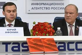 Секретарь ЦК КПРФ, первый заместитель председателя комитета Государственной думы (ГД) России по природным ресурсам, собственности и земельным отношениям Юрий Афонин (слева) и председатель ЦК КПРФ, руководитель фракции КПРФ в ГД России Геннадий Зюганов (справа) во время пресс-конференции, посвященной выходу книги Геннадия Зюганова "Время выбора, время действий!". Пресс-конференция прошла в агентстве ТАСС.