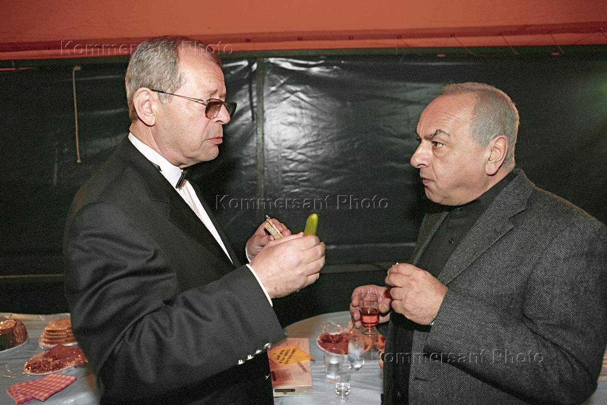 Писатель - сатирик Аркадий Арканов (слева) и музыкант Левон Оганезов (справа) на юбилейном шоу-капустнике поэта Владимира Вишневского в саду "Эрмитаж".