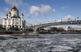 Жанровая фотография. Виды Москвы. Храм Христа Спасителя и пешеходный мост, соединяющий Пречистенскую и Берсеневскую набережные.
