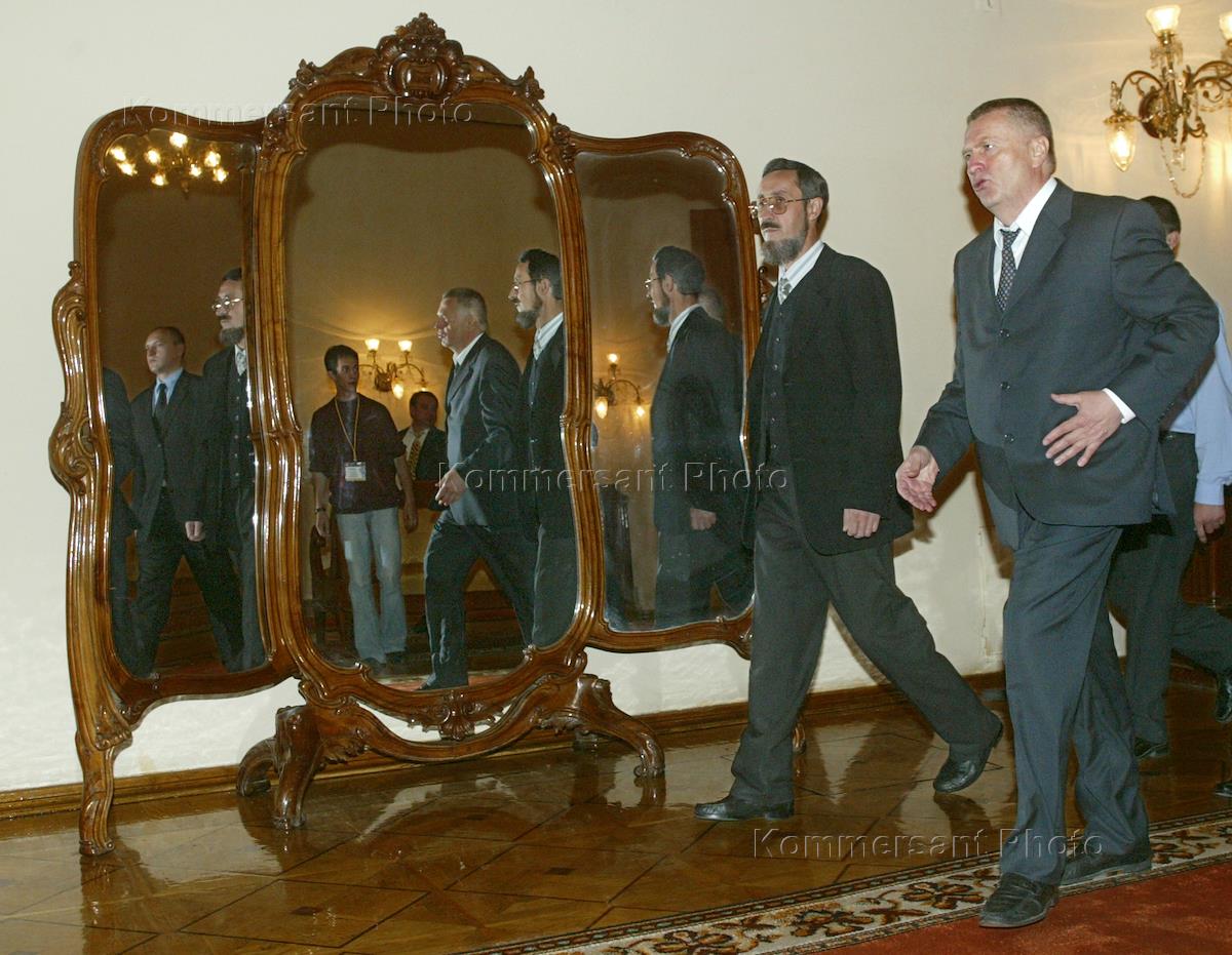 Leader of the Liberal Democratic Party (LDPR) Vladimir Zhirinovsky (right) arrives at the 14th party congress held in the Unions House Pillar Hall.