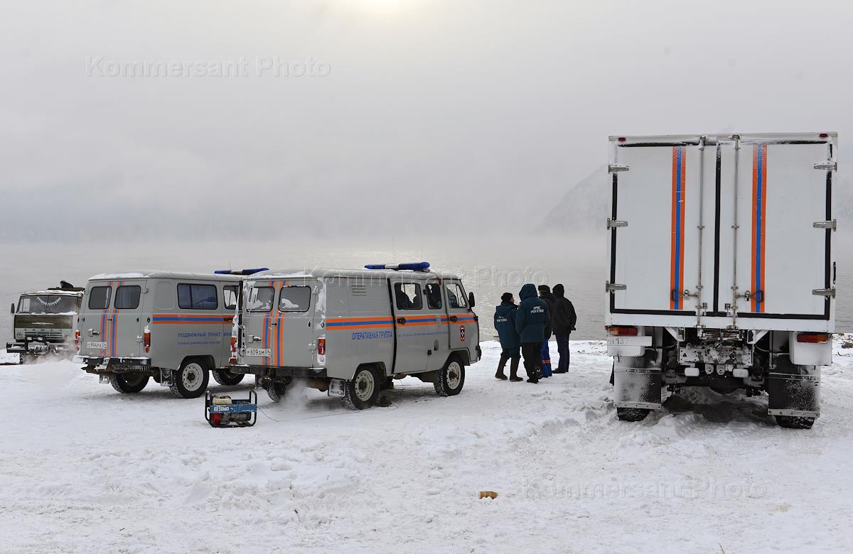 Rescue personnel are seen during a search operation carried out at the alleged crash site of a Robinson R-66 helicopter which disappeared on Sunday while flying over Lake Teletskoye in the Altai Mountains.