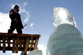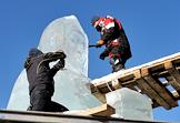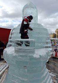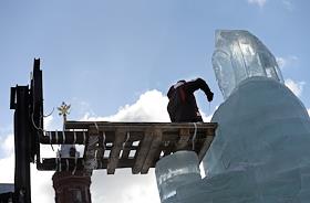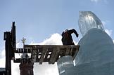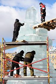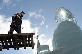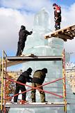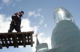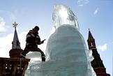 Подготовка к городскому фестивалю "Московская масленица". Установка ледяной скульптуры Масленицы на Манежной площади.