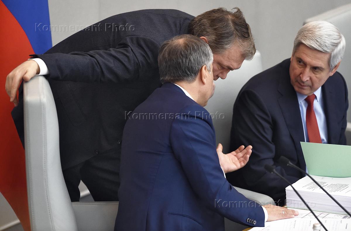 Пленарное заседание Государственной думы (ГД) России. Слева направо: член комитета ГД России по международным делам Виталий Милонов, член комитета ГД России по Регламенту и организации работы Государственной Думы Владимир Бурматов и член комитета ГД России по безопасности и противодействию коррупции Иван Квитка во время заседания.