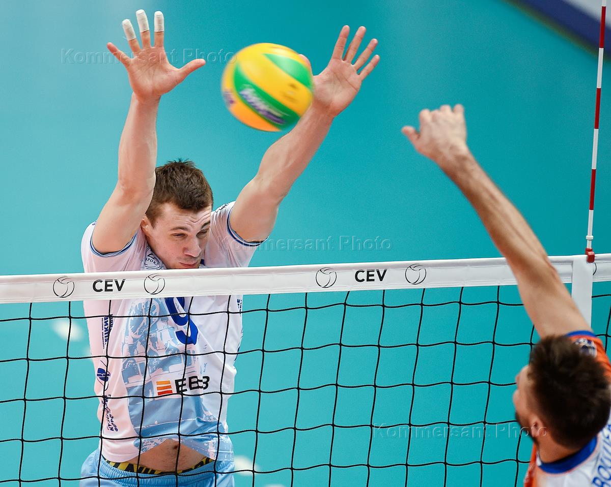 Лига чемпионов во волейболу. Матч между командами "Динамо" (Россия) и "ББСК Стамбул" (Турция) прошел во дворце спорта "Динамо". Игрок команды "Динамо" Дмитрий Бережко (слева) во время игры.