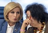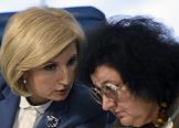 Член комитета Государственной думы России по государственному строительству и законодательству Ольга Баталина (слева) и член Координационного совета при президенте России по реализации национальной стратегии действий в интересах детей на 2012-2017 годы Галина Семья (справа) на пресс-конференции, посвященной взаимодействию усыновителей и опекунов с органами опеки и проблемам при процедуре изъятия приемных детей, проявившимся в истории с семьей Дель. Пресс-конференция прошла в пресс-центре агентства ТАСС.