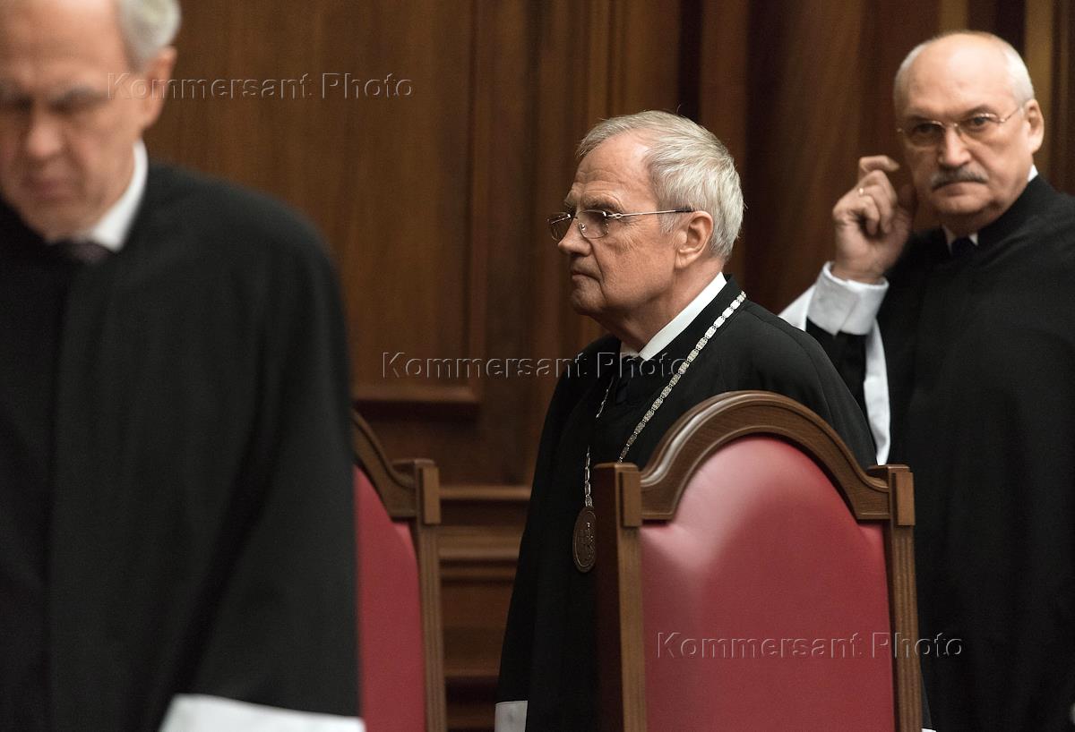 Заседание Конституционного Суда (КС) России по рассмотрению дела о проверке конституционности пункта 1 части третьей статьи 81 и статьи 4016 Уголовно-процессуального кодекса России по жалобе гражданина Александра Певзнера. Судья КС России Гадис Гаджиев (справа) во время заседания.