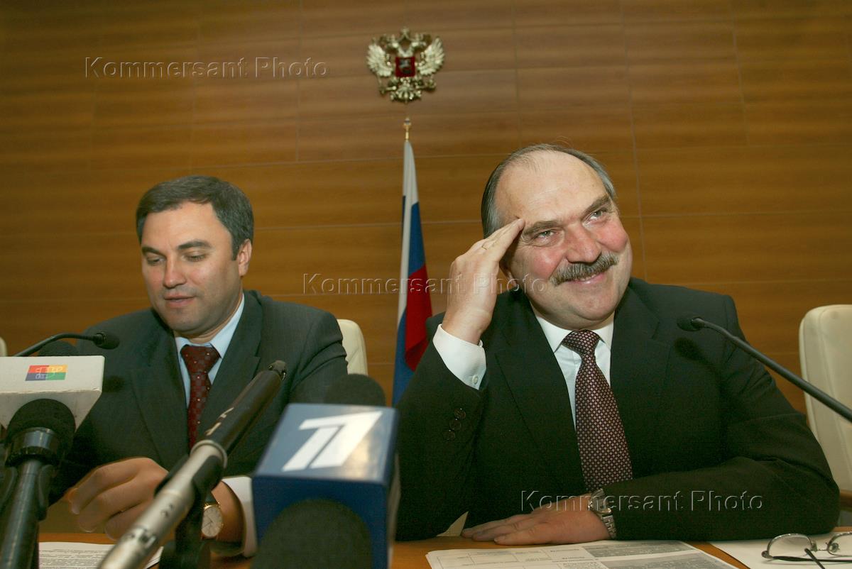 Leaders of the pro-Kremlin State Duma factions Vyacheslav Volodin (left) of the 'Fatherland - All Russia' (OVR) and Vladimir Pekhtin (rigth) of the 'Unity' are interviewed at the news conference headlined 'Centrist Factions Priorities for the Autumn Legislative Session'. The news conference was held in the State Duma smaller hall.