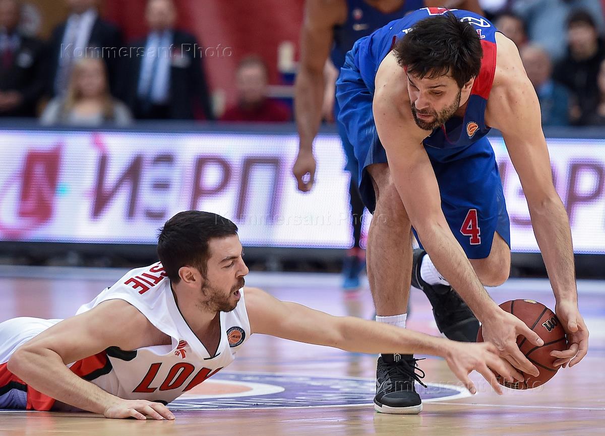 Единая лига ВТБ по баскетболу. Матч между командами ЦСКА (Москва) и "Локомотив-Кубань" (Краснодар) прошел в Универсальном спортивном комплексе (УСК) ЦСКА имени А.Я.Гомельского. Игрок команды "Локомотив-Кубань" Тэйлор Рочести (слева) и игрок команды ЦСКА Милош Теодосич (справа) во время матча.
