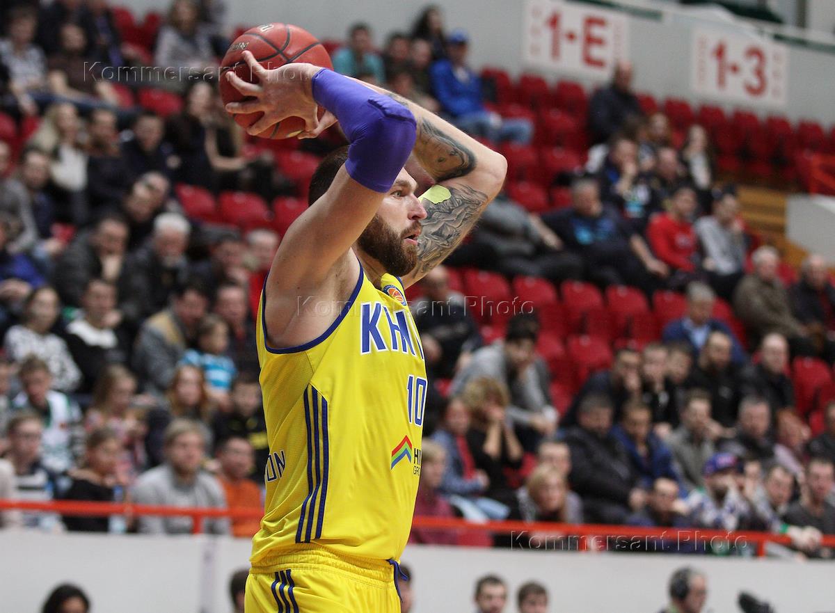 Единая лига ВТБ по баскетболу. Матч между командами УНИКС (Казань) и "Химки" (Химки, Московская область) на спортивной арене "Баскет-Холл". Игрок команды "Химки" Марко Тодорович (слева) во время матча.