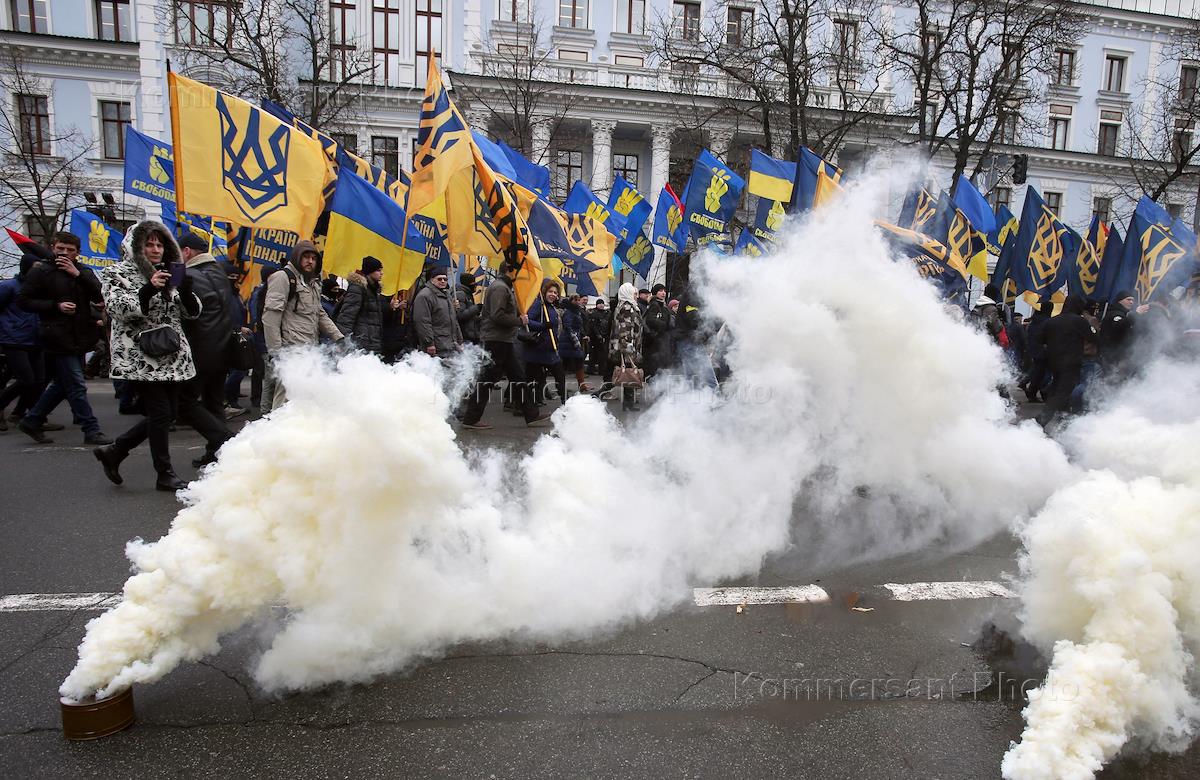 Марш достоинства, в котором приняли участие представители Национального корпуса "Азов", "Правого сектора" и ВО "Свобода". Билет в Липецк для Петра Порошенко.