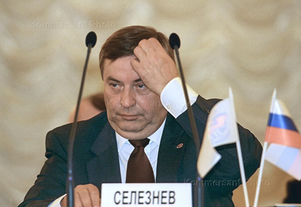 Chairman of the Russian State Duma and leader of the Russian Renaissance Party (PVR) Gennady Seleznev (left) and singer Nikolai Baskov (centre) attend the II meeting of the PVR.
