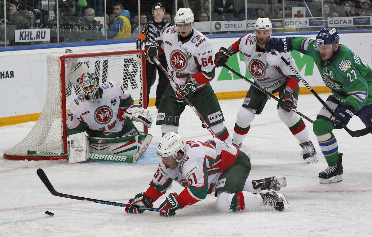 Континентальная хоккейная лига (КХЛ). 1/8 финала. Матч между командами "Салават Юлаев" (Уфа) и "Ак Барс" (Казань)на Универсальной спортивной арене (УСА) "Уфа - Арена". Игрок команды "Ак Барс" Джастин Азеведо (слева) и вратарь команды Эмиль Гарипов (второй слева) во время матча.