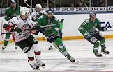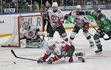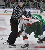 Континентальная хоккейная лига (КХЛ). 1/8 финала. Матч между командами "Салават Юлаев" (Уфа) и "Ак Барс" (Казань)на Универсальной спортивной арене (УСА) "Уфа - Арена". Игрок команды "Ак Барс" Александр Свитов (второй справа) и игрок команды "Салават Юлаев" Энвер Лисин (справа) во время матча.