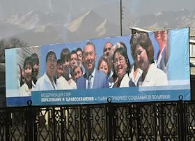 Рабочий визит президента России Владимира Путина в Алматы. Плакат с портретом президента Казахстана Нурсултана Назарбаева с надписью "Модернизация сфер образования и здравоохзранения - главный приоритет социальной политики!" на территории аэропорта.