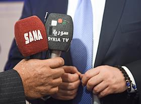 Пресс-конференция по итогам участия российской делегации в заседании Парламентской ассамблеи ОБСЕ в МИА "Россия сегодня". Жанровая фотография. Микрофоны Сирийского телевидения и Сирийского арабского информационного агентства SANA (САНА).